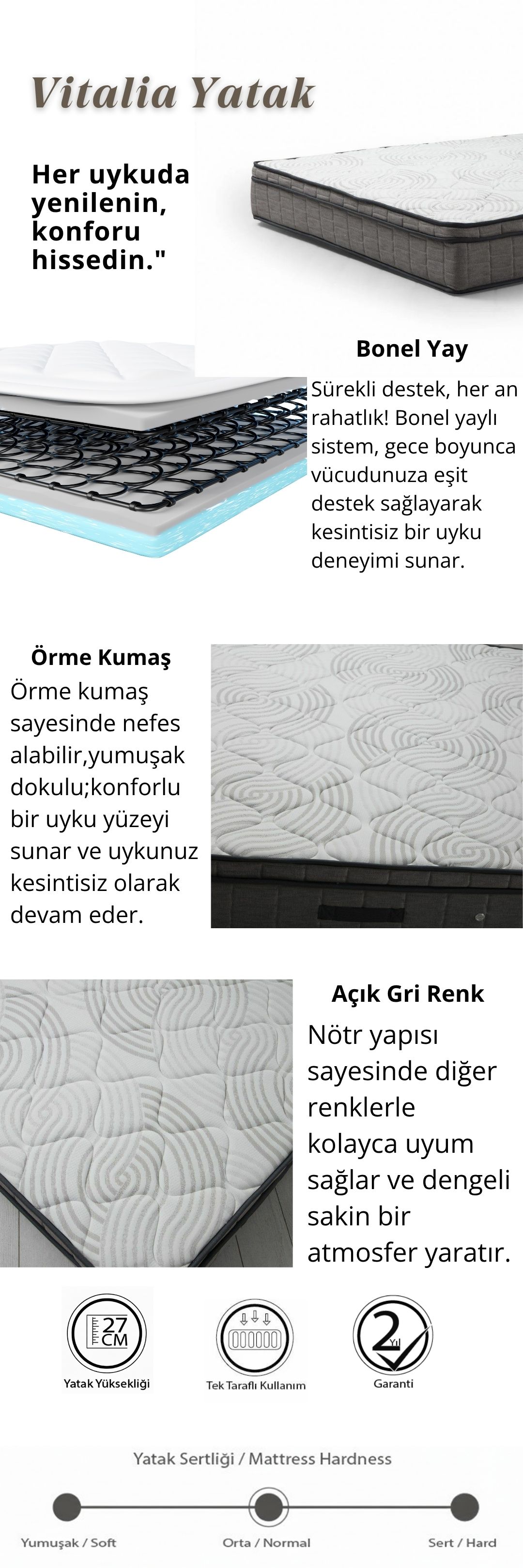Rahatlık ve desteği bir arada sunan Vitalia Gizli Pedli Yatak, orta sert yapısıyla dengeli bir uyku deneyimi sağlar. Örme kumaş üst yüzeyi yumuşak ve nefes alabilir bir yapı sunarken, şık açık gri rengi modern bir görünüm katar.