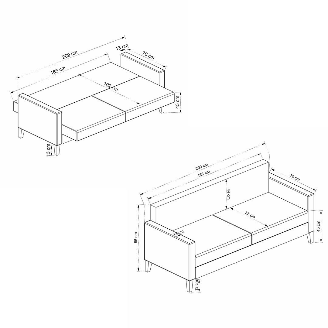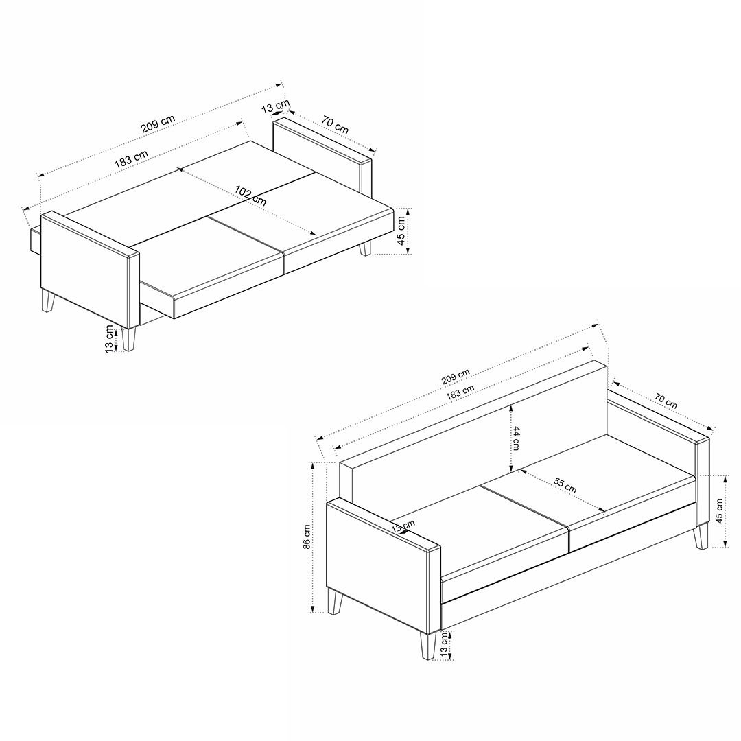 - Geniş ölçüler: 209 cm genişlik, 70 cm derinlik, 86 cm yükseklik.